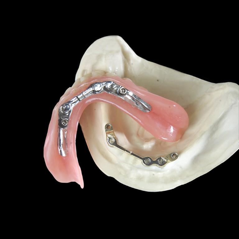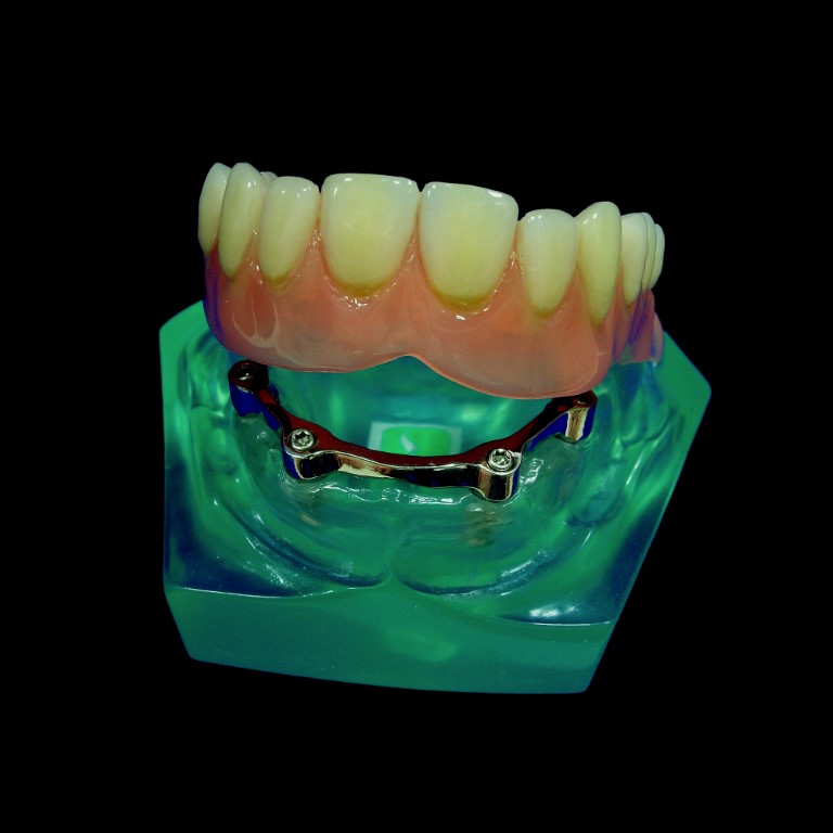 Es una prótesis mixta cuya base de resina cubre los implantes dentales osteo-integrados.