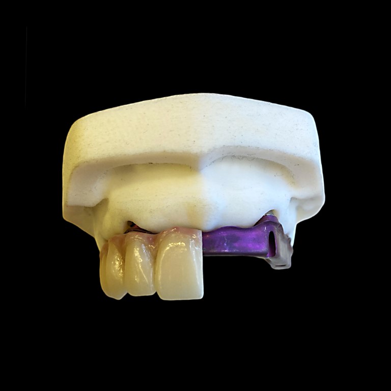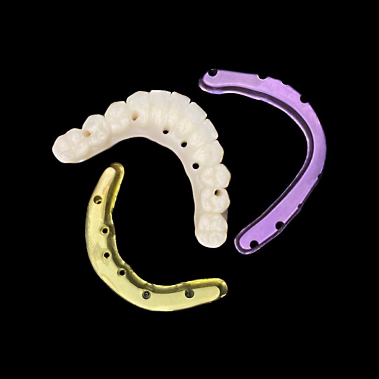 - Estructura metálica: Estas prótesis cuentan con una estructura interna metálica (generalmente de titanio o cromo-cobalto) que proporciona resistencia y durabilidad. Esta estructura sirve como base para la prótesis y se atornilla a los implantes. Si la realizamos en titanio se puede realizar anodizar (proceso electroquímico utilizado para modificar la superficie del titanio, creando una capa de óxido que puede tener diferentes colores) lo que produce que se disimule mejor el metal