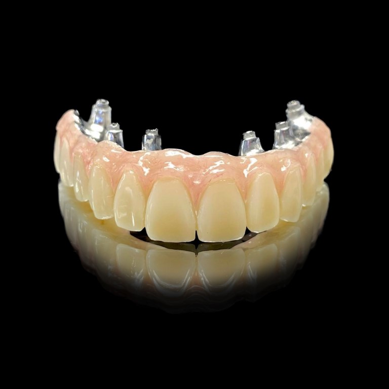 - Fija sobre implantes: La prótesis híbrida está anclada de forma fija a los implantes dentales mediante tornillos.
